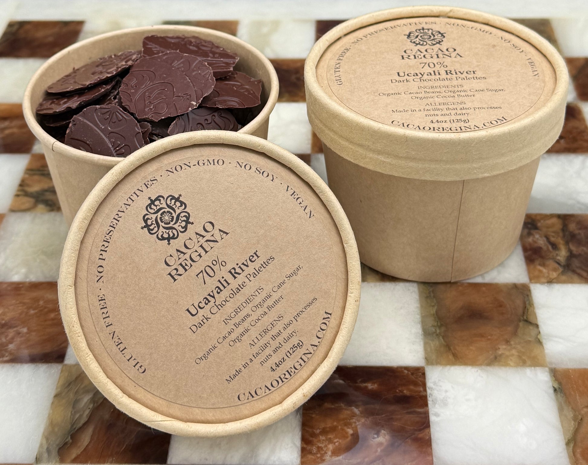Our cups are filled with the wafer-thin, easy-to-melt chocolate that we use for our sampling station at farmers markets and craft fairs. They’re very versatile. In addition to snacking and sharing, they can be used to elevate your appetizer, cookie, cake, pastry, and drinking chocolate recipes!